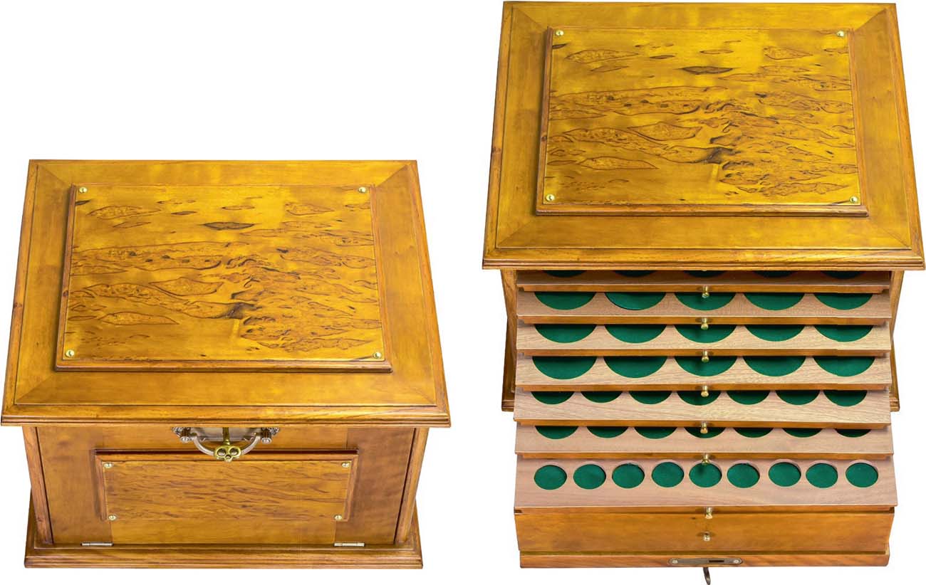 Корпус шпонирован карельской березой, покрыт шилаком. Планшетки выполнены из махагона (красное дерево). На 8 планшетках можно расположить коллекцию в 233 монеты. Диаметры 100 ложементов - 50 мм; 70 ложементов - 35 мм; 63 ложементов - 25 мм. Каждый из ложементов имеет суконную подложку и сквозное отверстие, что даёт возможность монетам "дышать" и покрываться благородной кабинетной патиной. Имеется вместительный ящик глубиной 50 мм для хранения слабов, бумаг и других крупных предметов хранения. Запирается на ключ. Вместимость: 233 монеты. Размер: 33,5х23х28,5 см. Вес: 7кг.