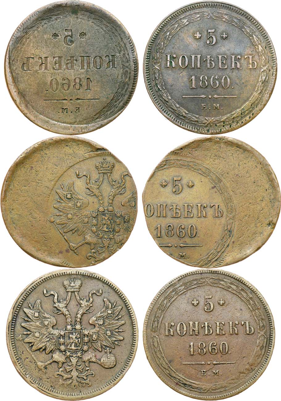 Медь. 5 копеек 1860 года. ЕМ. Инкузный брак. Медь, 24,52 г. AU 5 копеек 1860 года. ЕМ. Брак чекана (смещение кружка). Медь, 22,5 г. AU 5 копеек 1860 года. ЕМ. Увеличенный вес (чекан на толстом кружке). Медь, 30.14 г. AU 50 XF/AU.