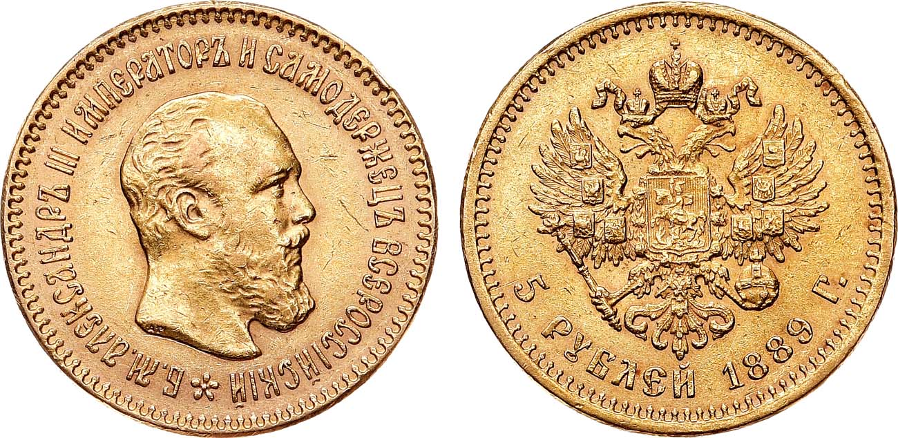 5 рублей 1889 года с инициалами медальера «А.Г.» в обрезе шеи встречаются редко.