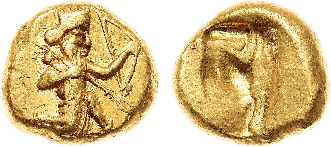 Персидский золотой дарик с изображением лучника. Монета содержала 8,4 г чистого золота. Дарик составлял 1/3000 часть персидского царского таланта в 25,92 кг.