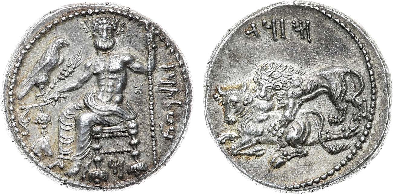 Серебро. 10,92г. Тарс. Аверс: изображение сидящего на троне Баалтара с орлом, гроздью винограда и ветвью в правой руке; левой рукой опирается на скипетр. Реверс: изображение нападающего на быка льва. AU/UNC.