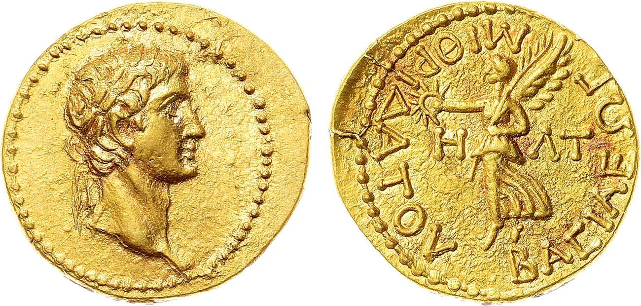 Золото. 7,88г. Пантикапей. Аверс: портрет Калигулы вправо. Реверс: круговая легенда "ΒΑCΙΛΕΩC ΜΙΘΡΙΔΑΤΟΥ"; изображение богини Ники с венком и ветвью влево, по сторонам обозначение даты "ΗΛΤ" (338 г. б. э.). Анохин (1986) 329. Анохин (2011) 1429. MacDonald D.310. AU/UNC.
