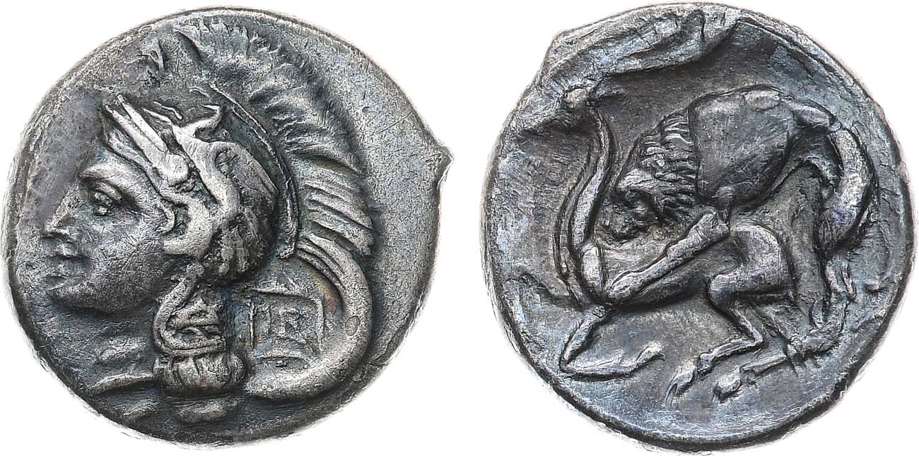 Серебро. 7,33г. Аверс: изображение головы Афины в аттическом шлеме. Реверс: изображение сцены нападения льва на оленя. ANS 1400. München 895. Williams, Velia 550. Italy 1318. HGC 1 1326. VF.