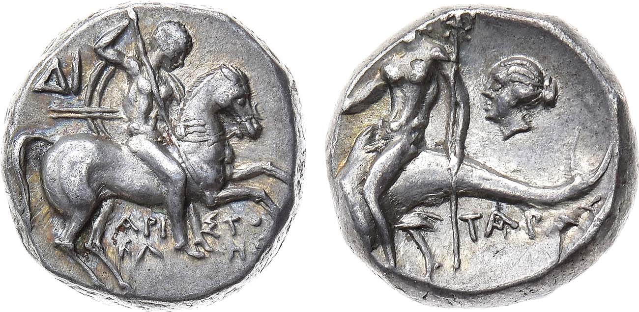 Серебро. 6,37г. Тарент. Аверс: изображение всадника - вправо; слева на поле монограмма "ΔΙ"; строчная легенда. Реверс: изображение Тараса (Тарента) верхом на дельфине, справа на поле - изображение женской головы; строчная легенда "TAPAΣ". AU.
