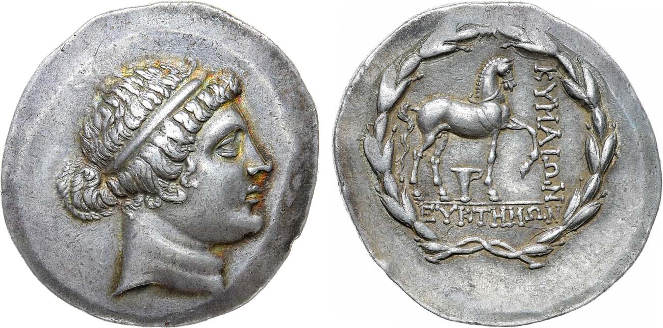 Изображение богини на аверсе монеты, венка на реверсе и широкий монетный кружок позволяют причислить эту тетрадрахму к знаменитым стефанофорам - шедеврам эллинистической монетной чеканки.