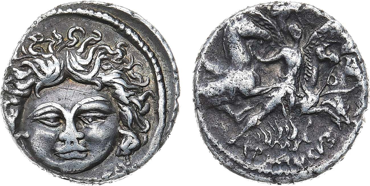 Серебро. 4,02г. Рим. Аверс: изображение маски Медузы. Реверс: изображение богини Виктории - вправо. Crawford 453/1c. VF.