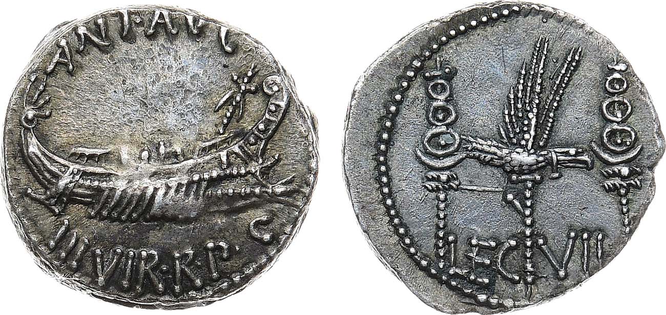 Серебро. 3,6г. Аверс: круговая легенда "ANT AVG - III VIR R P C"; изображение галеры со скипетром, привязанным к носу вправо. Реверс: легенда "LEG VII". Crawford 544/20. RBW 1842. Sydenham 1224. AU.