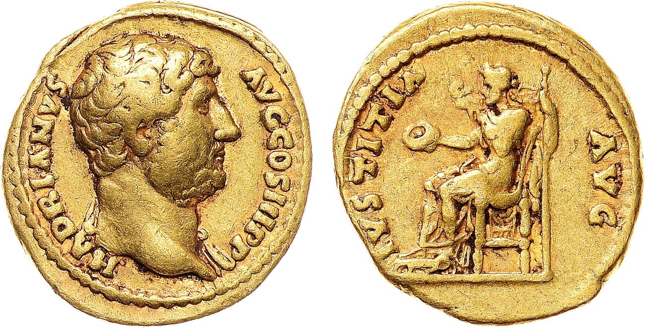 Золото. 7,22г. Аверс: бюст императора вправо; легенда "HADRIANVS AVG COS III P P". Реверс: Юстиция сидит на троне влево; держит в руках патеру и скипетр; легенда "IVSTITIA AVG". VF.
