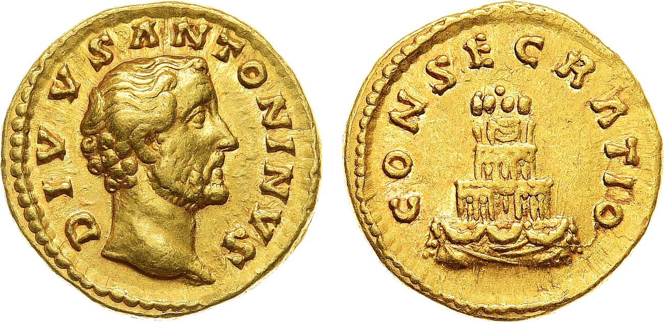 Золото. 7,27г. Рим. Аверс: круговая легенда "DIVVS ANTONINVS"; портрет императора вправо. Реверс: круговая легенда "CONSECRATIO". Calicо 1491. RIC 435. XF+/AU.