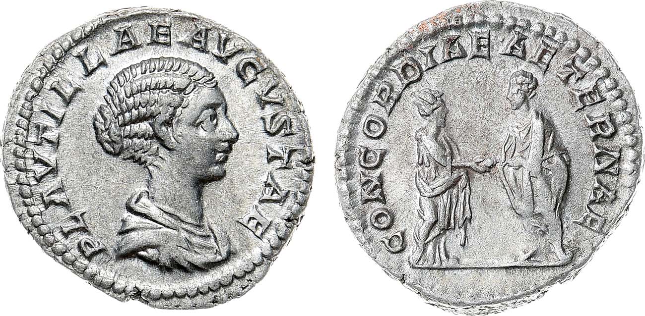 Серебро. 3,42г. Рим. Аверс: бюст Плаутиллы вправо; легенда "PLAVTILLAE AVGVSTAE". Реверс: императрица пожимает руку императору; легенда "CONCORDIAE AETERNAE". UNC.