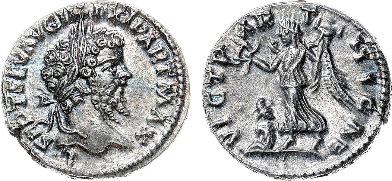Серебро. 3,27г. Рим. Аверс: голова императора в лавровом венке вправо; легенда "L SEPT SEV AVG IMP XI PART MAX". Реверс: Виктория, идущая влево, с венком и трофеем в руках, слева внизу сидит пленник; легенда "VICT PARTHICAE". UNC.