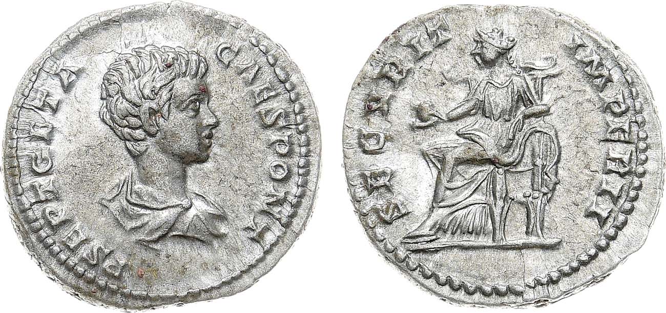 Серебро. 3,11г. Аверс: драпированный бюст Геты вправо; легенда "P SEPT GETA CAES PONT". Реверс: сидящая влево Секуритас, держит в правой руке сферу и опирается левой на трон; легенда "SECVRIT IMPERII". UNC.