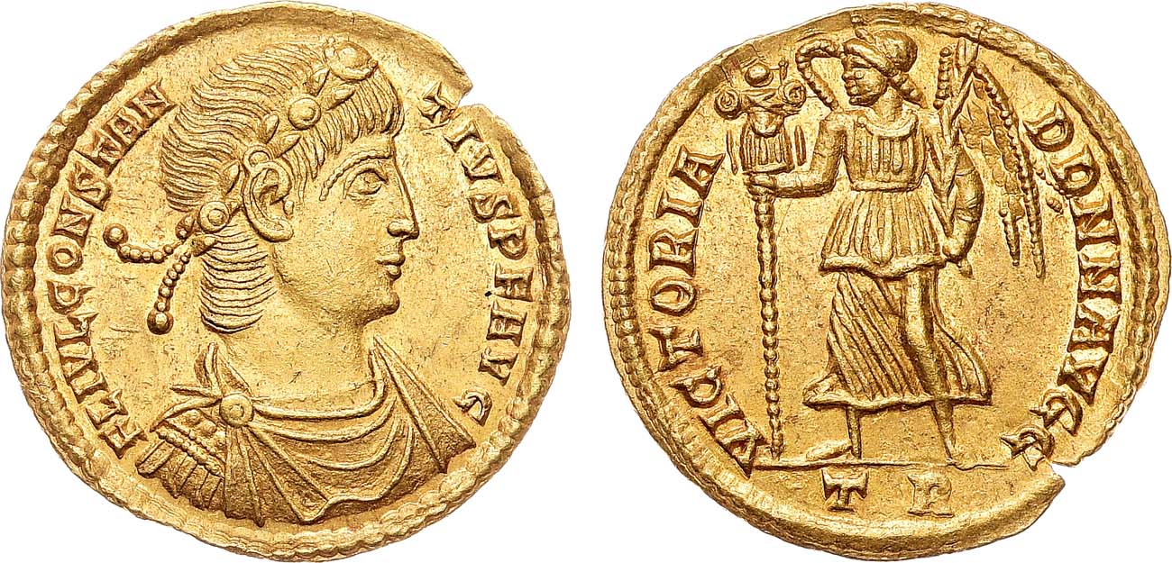 Золото. 4,45г. Трир. Аверс: круговая легенда "FLIVL CONSTANTIVS PF AVG"; портрет императора вправо. Реверс: круговая легенда "VICTORIA DD NN AVGG"; изображение богини Виктории - влево. Sear 17820. UNC.