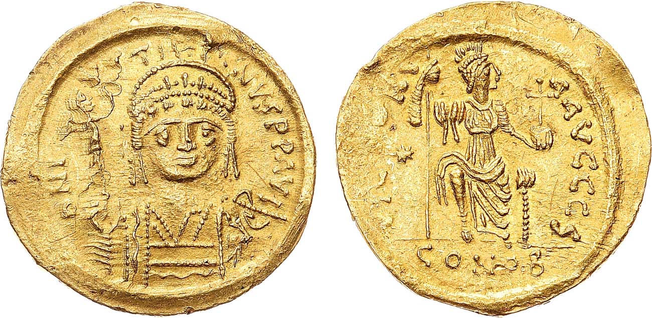 Золото. 4,46г. Константинополь. Аверс: круговая легенда "DN I-VSTI-NVS PP AVG"; портрет императора анфас с богиней Викторией на правом плече. Реверс: круговая легенда "VICTORI-A-AVCCC"; персонификация Константинополя на троне; внизу под чертой "CONOB". Sear 345. Sommer 5.2. UNC.