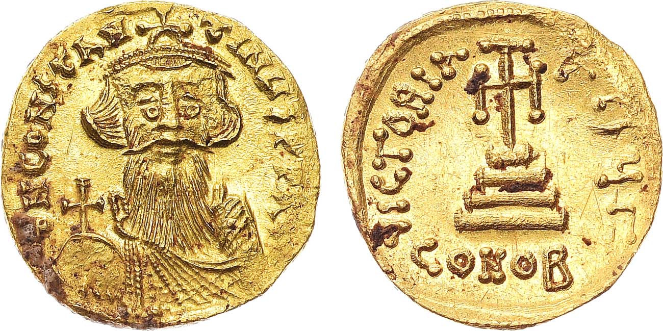 Золото. 4,49г. Константинополь. Аверс: круговая легенда "DN CONSTAN-TINЧS PP AVC; изображение императора анфас в короне с крестом, с державой в правой руке. Реверс: "VICTORIA-AVГЧ Г", изображение Креста на четырёх ступенях, внизу "CONOB". Sear 956. Sommer 12.15. UNC.