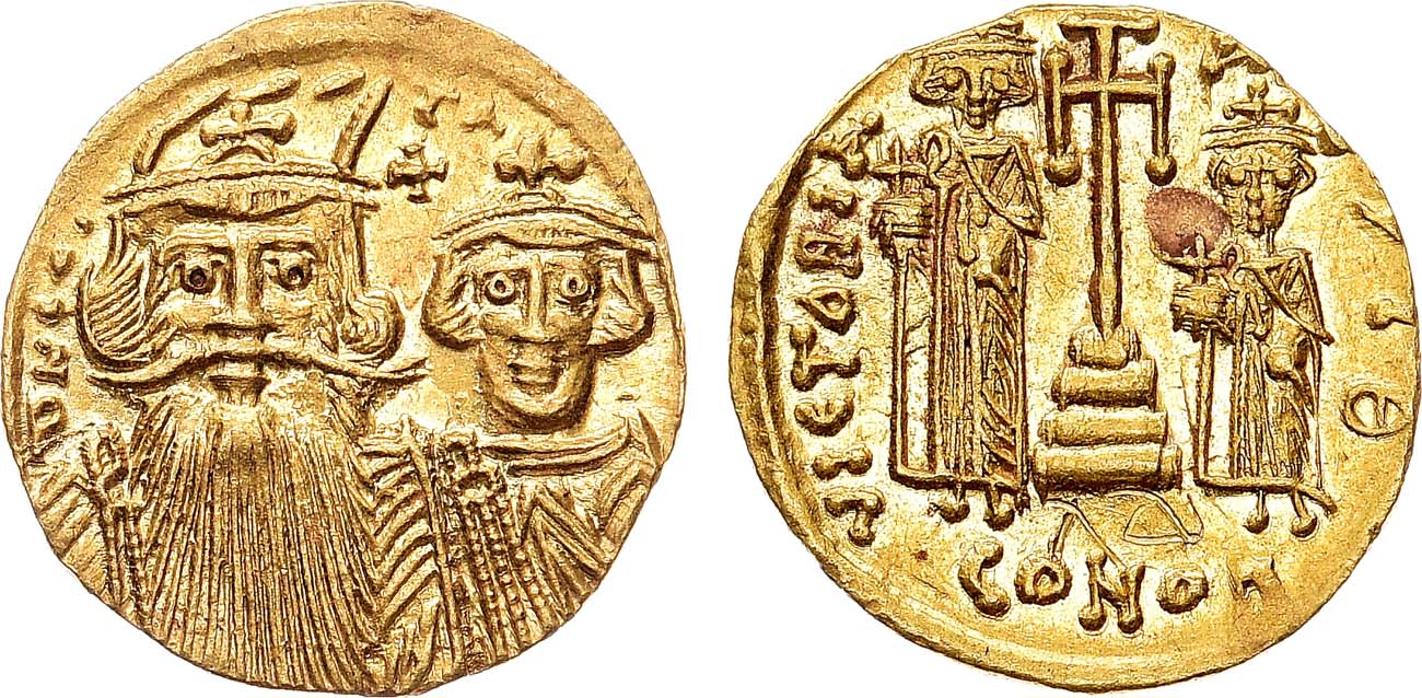 Золото. 4,49г. Константинополь. Аверс: круговая легенда "DN CONS-TANI"; портреты Константа II с длинной бородой и Константина IV. Реверс: круговая легенда "VICTORI-A-AVГЧО"; Крест на 3 ступенях; изображения Ираклия и Тиверия по сторонам; внизу "CONOB". Sear 964. Sommer 12.23. UNC.