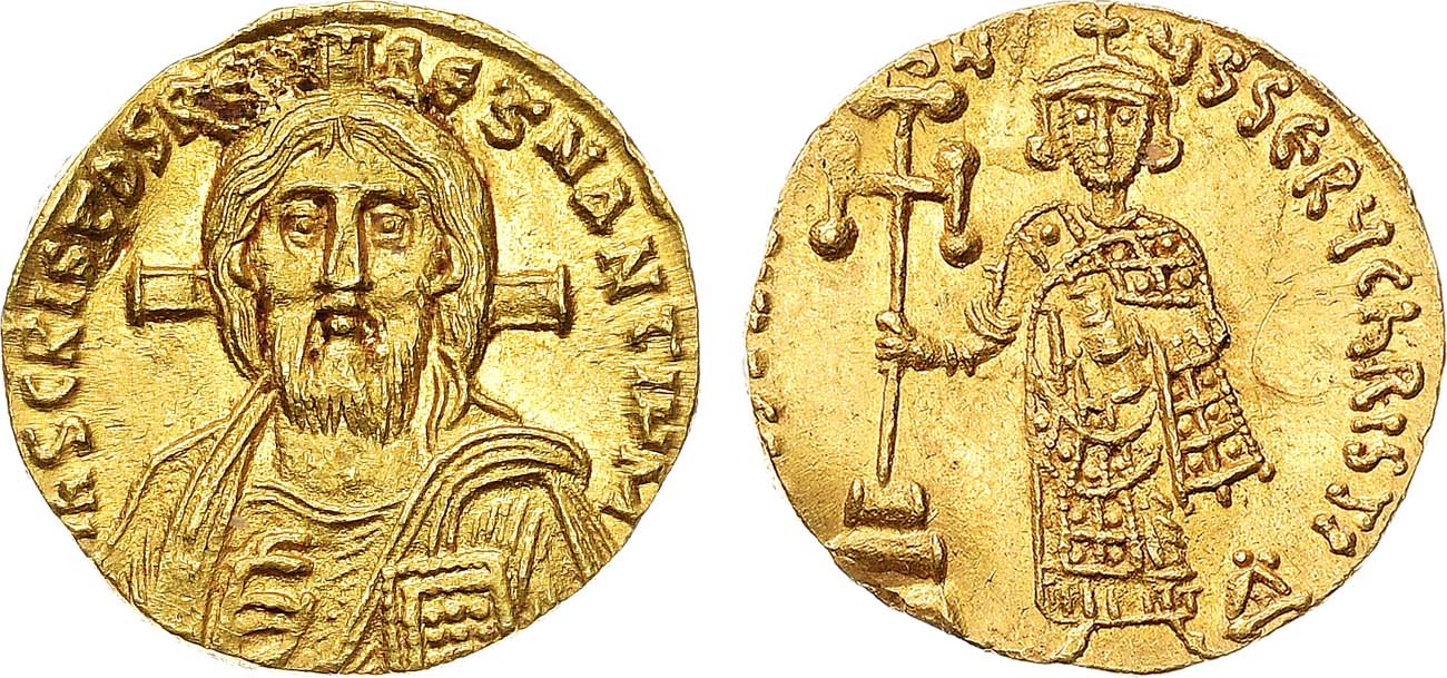 Золото. 4,46г. Константинополь. Аверс: изображение Христа с поднятой правой рукой и Евангелием - в левой. Круговая легенда "IhS CRISTOS RЕX RЕGNANTIUM". Реверс: круговая легенда "D IЧSTINI-ANЧ-S SЕRЧ CRISTI S"; изображение Юстиниана, держащегося за Крест на основании из трёх ступеней - в правой руке и акакией - в левой. Sear 1248. Sommer 14.5.2. UNC.