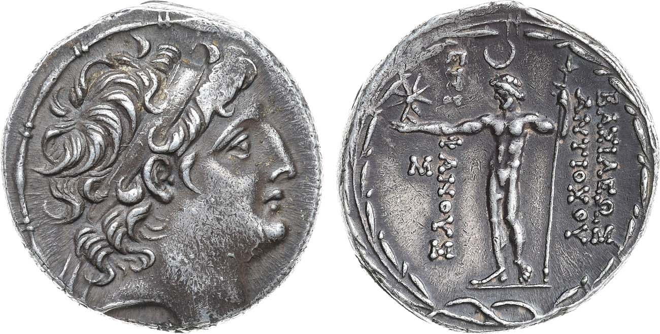 Серебро. 16,82г. Аверс: портрет Антиоха в диадеме вправо. Реверс: изображение стоящего Зевса, держащего в правой руке звезду и скипетр - в левой; вертикальная легенда "BAΣIΛEΩΣ ANTIOXOY EΠIΦANOYΣ". AU.