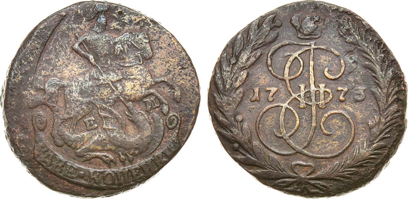 Медь. 19,43г. Заготовка для монеты вырублена из 5 копеек образца 1763 года (отчетливо видны следы трех корон на реверсе). Уздеников 2729. Биткин 675. Дьяков 96, 300. Brekke 118, 165. VF+.