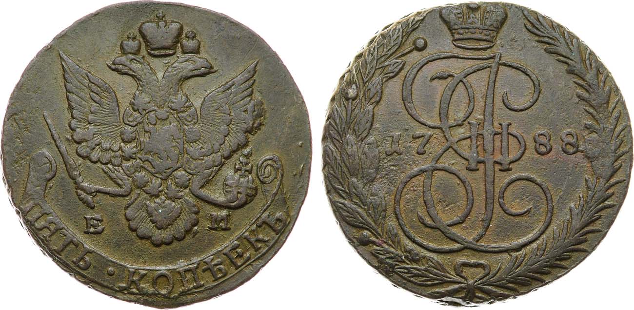 Медь. 50,84г. Аверс: орёл образца 1780-1787 гг. Реверс: вензель и корона больше. Уздеников 2792(•). Биткин 640(R1). 3 рубля по Петрову. 5 рублей по Ильину. Дьяков 171, 596(R1). Brekke 121, 268(–). XF+/AU.
