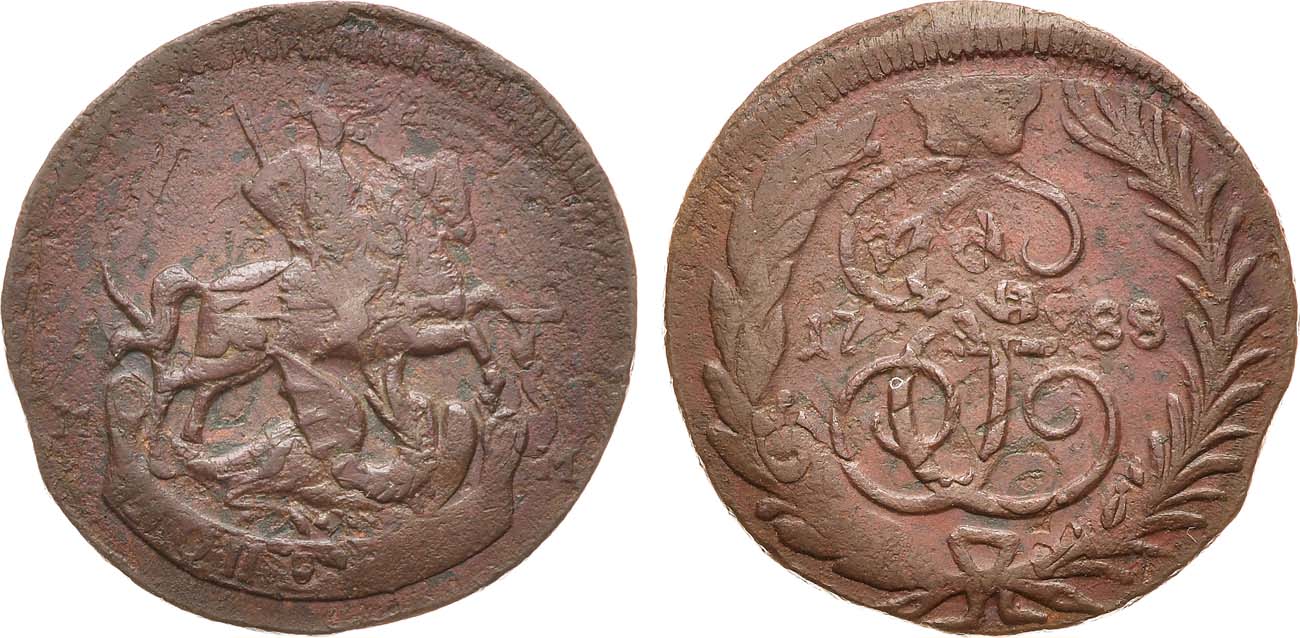 Копейки 1788 года в коллекционной сохранности с явными следами перечекана из 2 копеек 1762 встречаются очень редко.