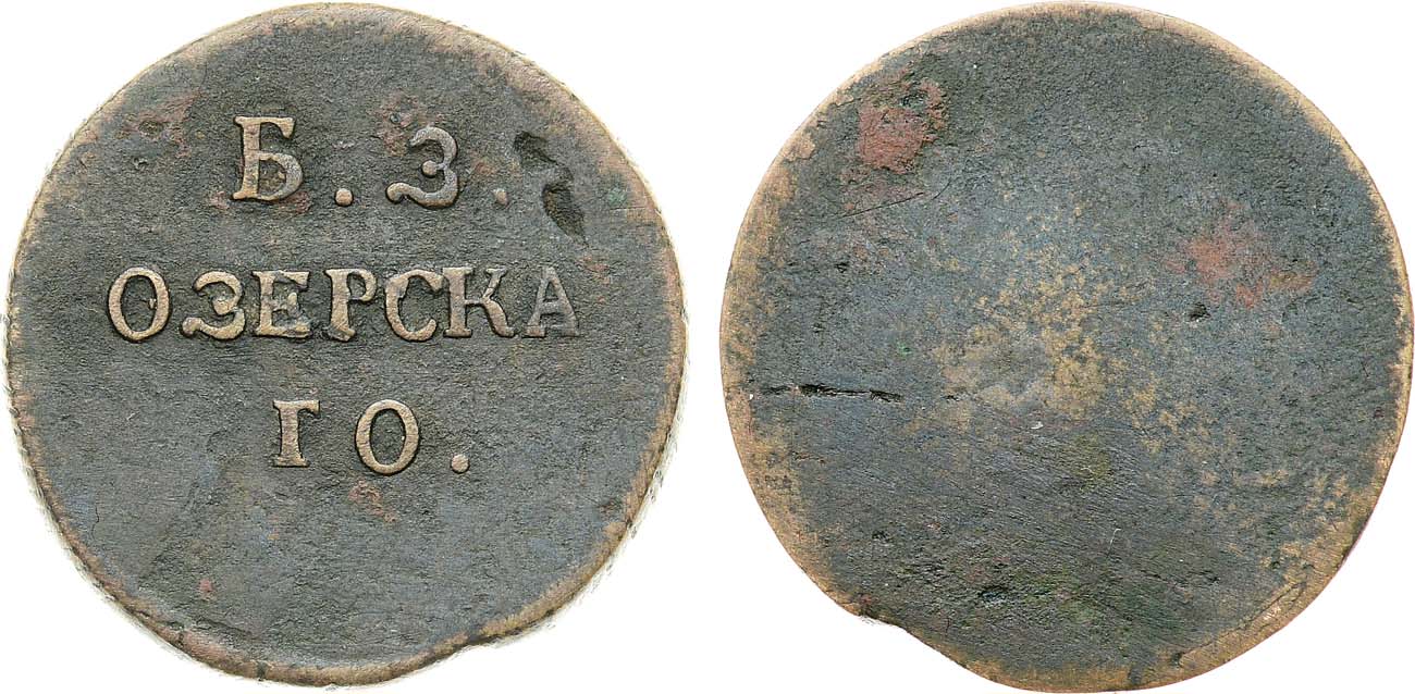 Медь. 8,71г. Диаметр 26 мм. Сузунский монетный двор. Односторонняя. Аверс: "Б.З. / ОЗЕРКА / ГО.". Григорьев, Черноухов 0028 (÷). XF.