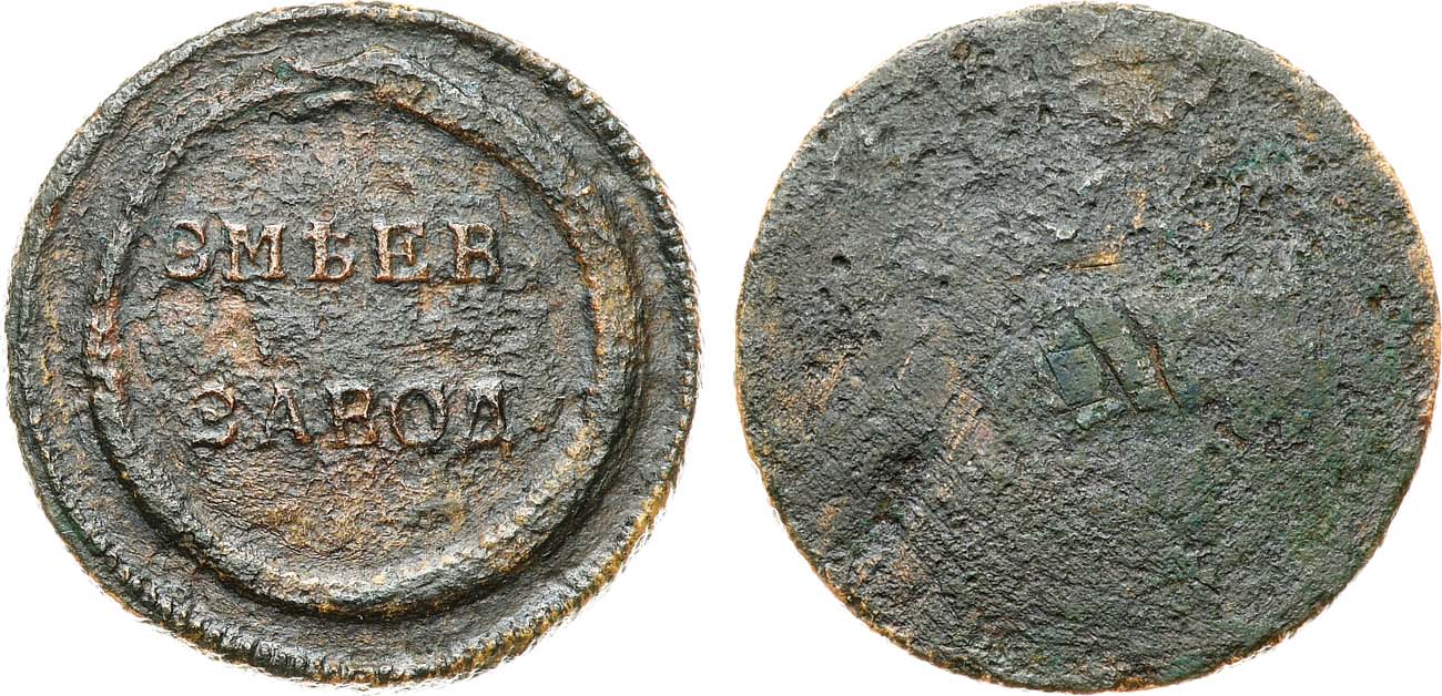 Железо. 7,93г. Диаметр 26 мм. Сузунский монетный двор. Односторонняя. Аверс: надпись "ЗМѢЕВ. / ЗАВОД." внутри рамки в виде уробороса. Гурт шнуровидный. Григорьев, Черноухов 0379(÷). VF-.