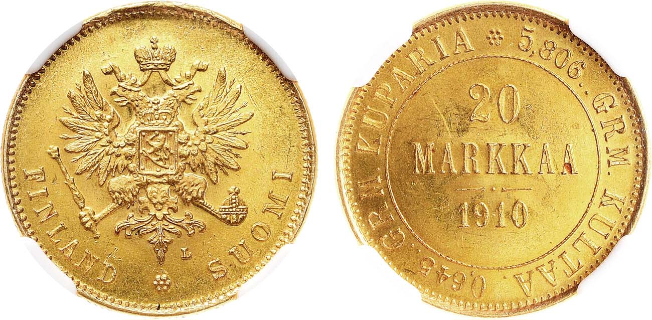 Золото. Для Финляндии. Гельсингфорсский монетный двор. Тираж: 201.000 экз. Уздеников 4801(–). Биткин 387. Казаков 389(R). MS 64.