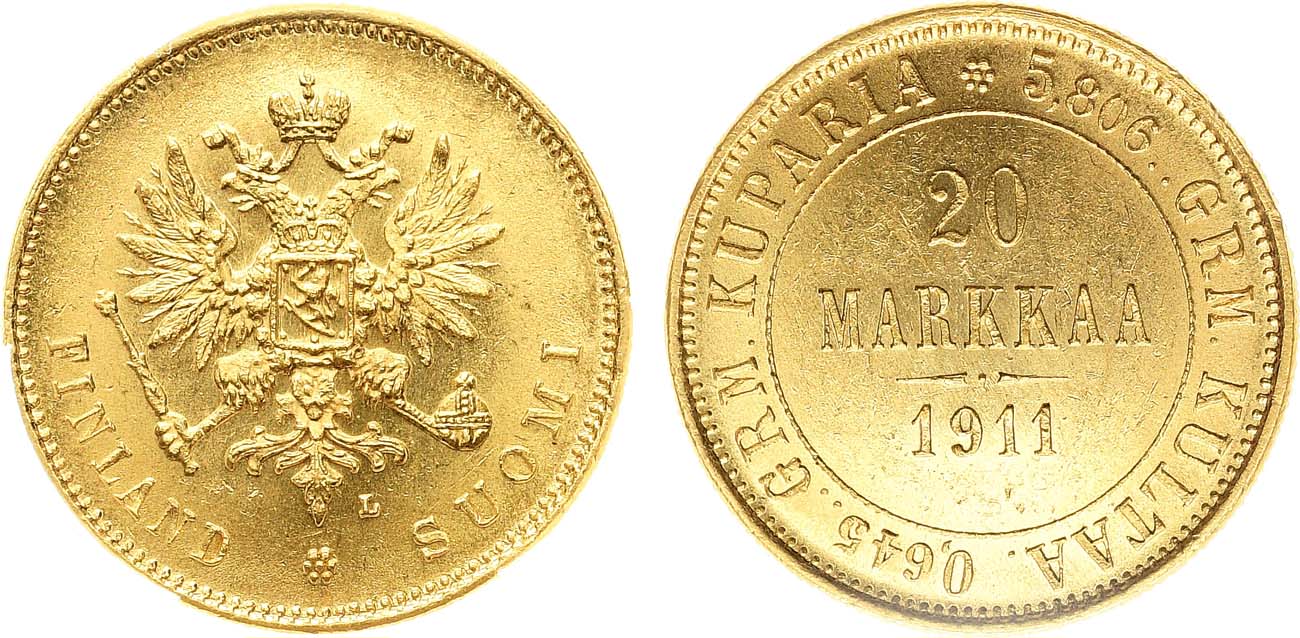 Золото. Для Финляндии. Гельсингфорсский монетный двор. Тираж: 161.000 экз. Уздеников 4805(–). Биткин 388. Казаков 411(R). MS 63.