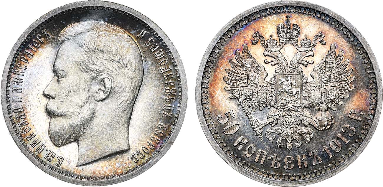 50 копеек 1913 года с инициалами минцмейстера (ЭБ) встречаются гораздо реже, чем с буквами (ВС).
