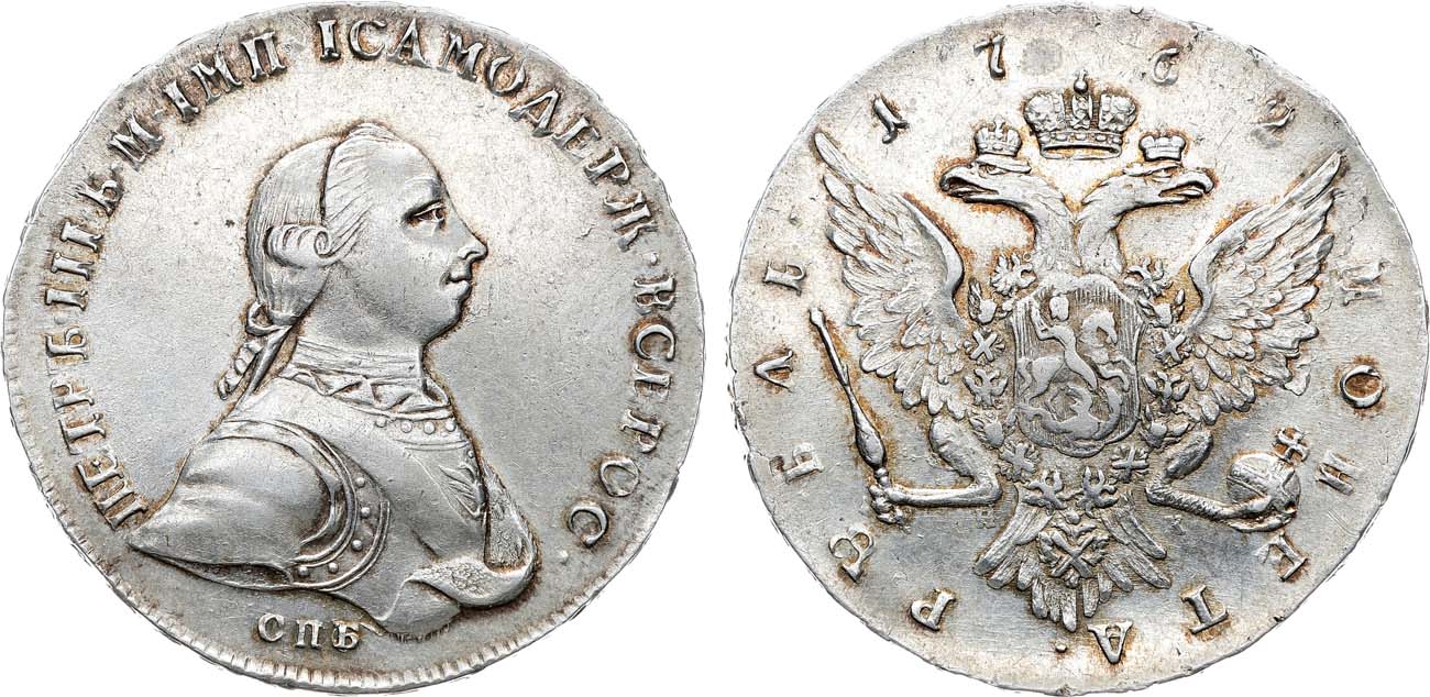 Рубли периода правления императора Петра III с гуртовой надписью, отчеканенные на Санкт-Петербургском монетном дворе, встречаются очень редко. С аукциона Kuenker 146, Оснабрюк, октябрь 2008 года, лот 8260.
