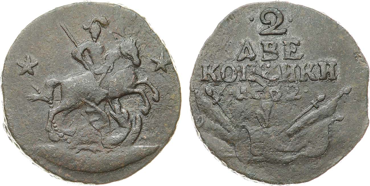 Медь. 11,46г. Без обозначения монетного двора. С военной арматурой. Реверс: дата "1762", номинал выделен точками, три знамени. Гурт сетчатый. Уздеников 2629(•). Биткин 33(R). Дьяков 182, 40(R1). Brekke 105, 6. XF.