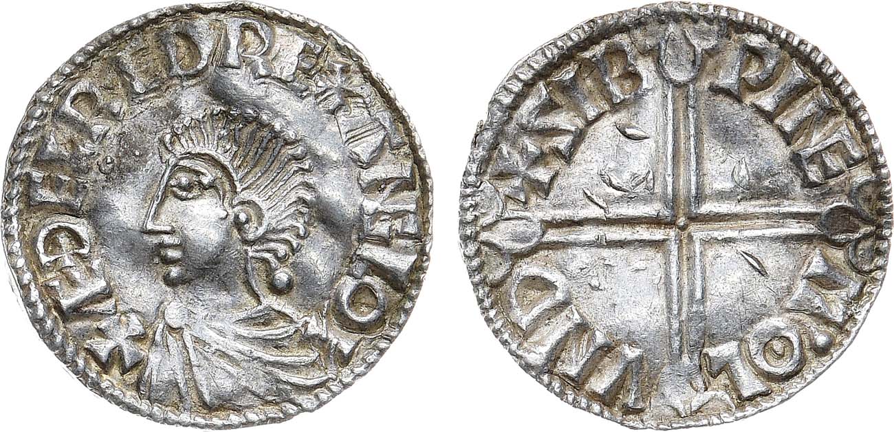 Серебро. 1,69г. Лондон. Аверс: изображение головы короля - влево; круговая легенда: "+ EDELRED REX ANGLOI". Реверс: круговая легенда "+ZIB-PINE-MOL-VND"; изображение большого Креста. Seaby 1151, North 774. AU/UNC.