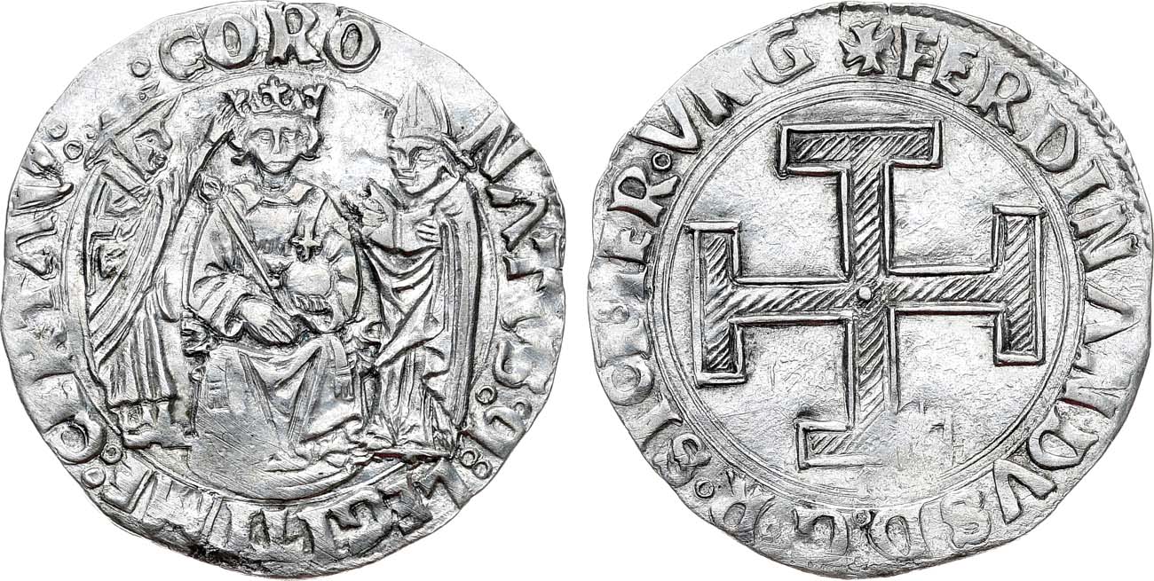 Серебро. 3,92г. Минцмейстер Сальваторе Миробалло (M под крестом). Аверс: "CORONATVS • QVIA • LEGITIME • CERTAVIT" (Коронован в законном стремлении). Папский легат - кардинал и архиепископ Бари Латино Орсино водружает корону на голову короля (Фердинанда) сидящего на троне. Реверс: "FERDINANDVS D G R SICI IER VN". Иерусалимский крест в центре. AU.