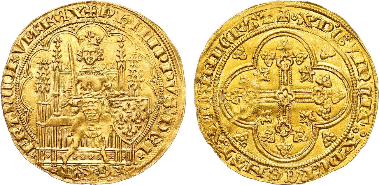 Золото. 4,48г. Аверс: изображение короля с мечом на троне; круговая легенда " + PHILLIPPVS ⁑ DЄI / ˣ GRA ˣ / FRANCORVM ⁑ RЄX". Реверс: изображение украшенного креста; круговая легенда "+ XP'C ⁑ VINCIT ⁑ XP'C ⁑ RЄGNAT ⁑ XP'C ⁑ INPЄRAT". Duplessy 249. Fried 270. Ciani 282. AU/UNC.