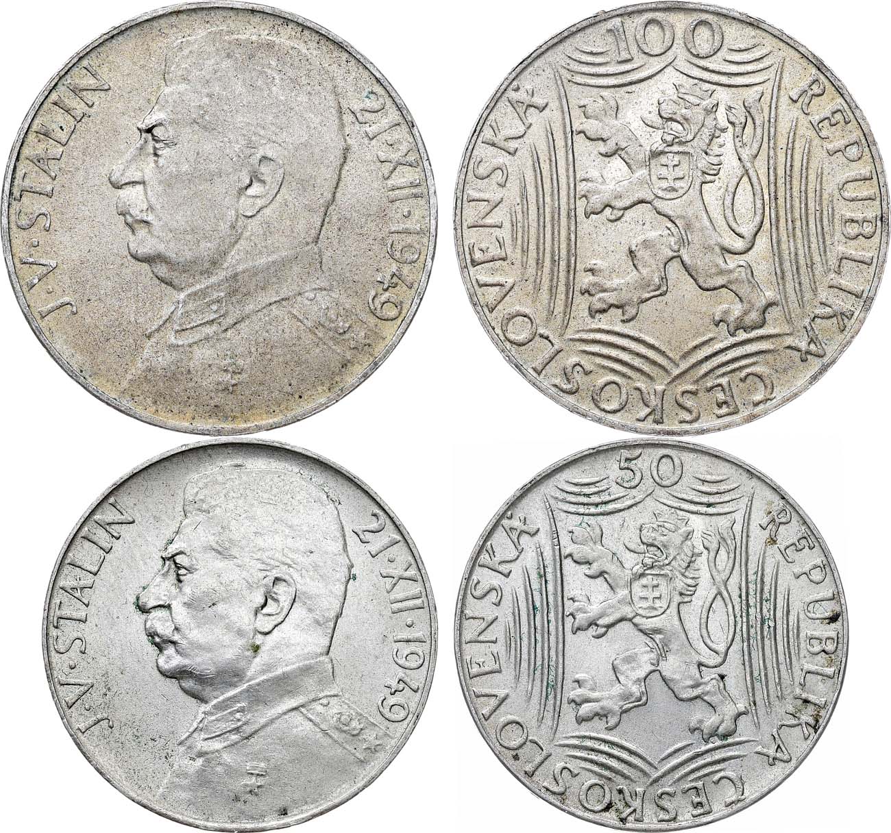 Серебро. Чехословакия. 100 крон 1949 года. Серебро. 14,03 г. Кремница. 70 лет со дня рождения Иосифа Сталина. KM 30. MS 63. Чехословакия. 50 крон 1949 года. Серебро. 10,04 г. Кремница. 70 лет со дня рождения Иосифа Сталина. KM 28. MS 64.