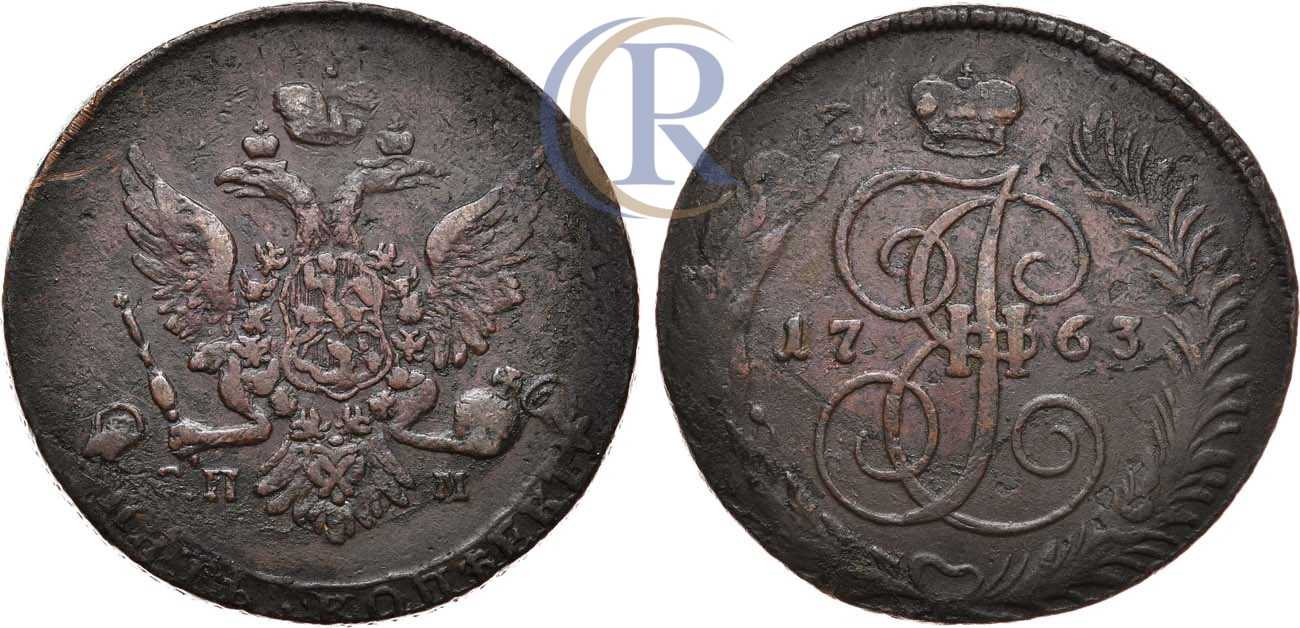 Медь. 48,21г. Санкт-Петербургский монетный двор. Перечекан из "арматурных" 10 копеек 1762 года. Аверс: буквы "СПМ" крупнее. Реверс: корона меньше, бант больше. Уздеников 2633. Биткин 564. 50 копеек по Петрову. Дьяков 23, 29. Brekke 119, 199. XF.