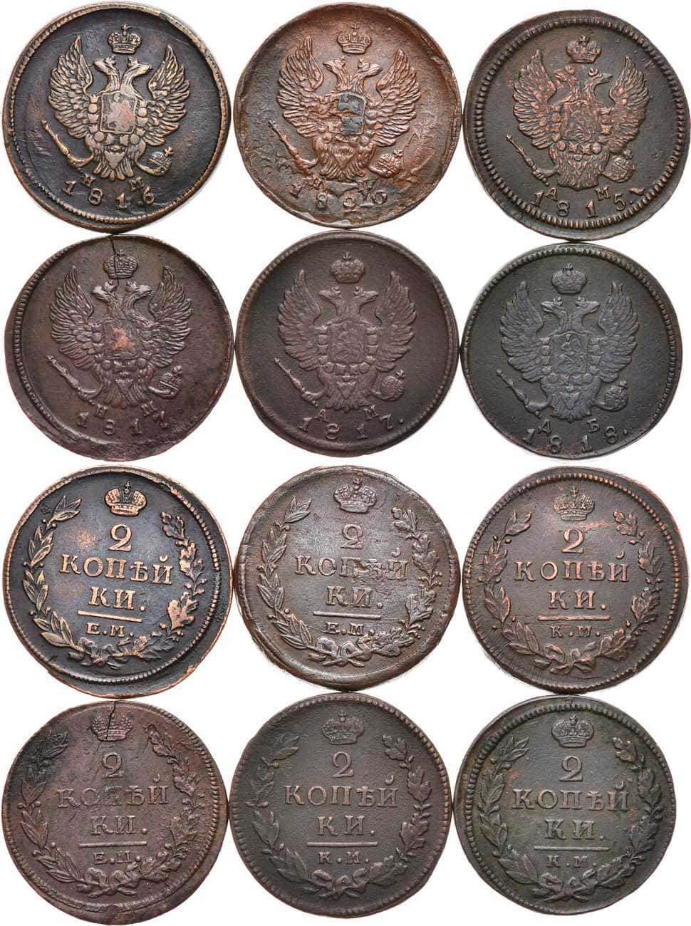 Медь. 2 копейки 1815 года. КМ. АМ. 13,41 г. 2 копейки 1816 года. ЕМ. НМ. 15,55 г. 2 копейки 1817 года. ЕМ. НМ. 11,77 г. 2 копейки 181 года. КМ. АМ. 11 г. 2 копейки 1818 года. КМ. ДБ. 13,86 г. 2 копейки 1820 года. ЕМ. НМ. 10,66 г.