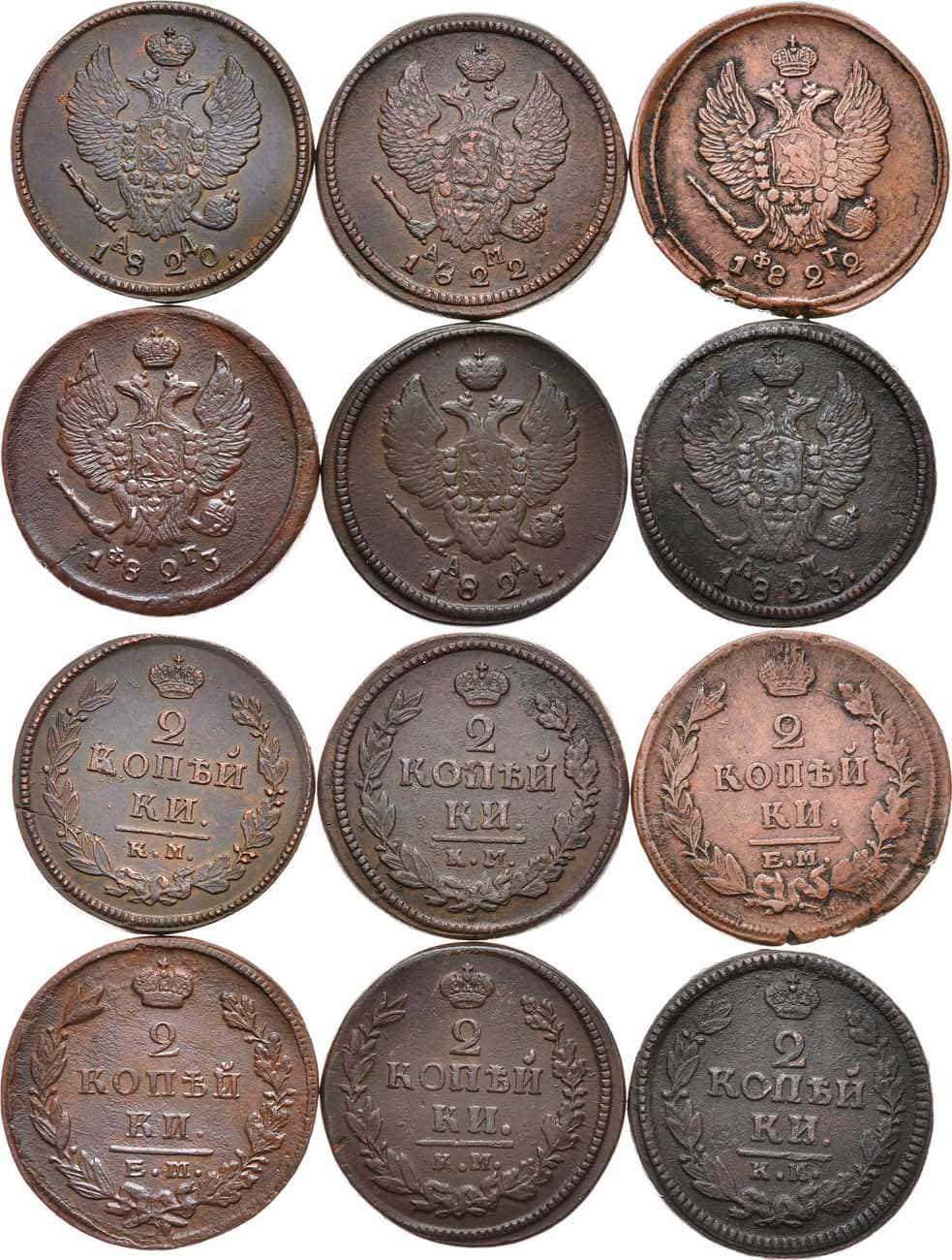 Медь. 2 копейки 1820 года. КМ. АД. 15,28 г. 2 копейки 1821 года. КМ. АД. 15,51 г. 2 копейки 1822 года. КМ. АМ. 14,91 г. 2 копейки 1822 года. ЕМ. ФГ. 14,19 г. 2 копейки 1823 года. КМ. АМ. 13,42 г. 2 копейки 1823 года. ЕМ. ФГ. 14,28 г.