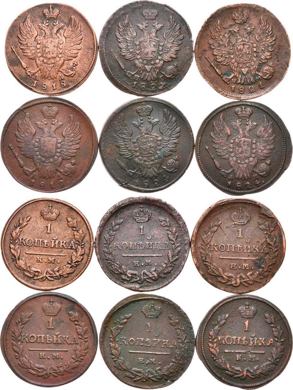 Медь. 1 копейка 1818 года. КМ.АД. 6,40 г. 1 копейка 1819 года. КМ.АД. 6,61 г. 1 копейка 1821 года. ЕМ.НМ. 5,42 г. 1 копейка 1822 года. ЕМ.ПГ. 5,90 г. 1 копейка 1824 года. ЕМ.ПГ. 6,88 г. 1 копейка 1824 года. КМ.АМ. 5,45 г.