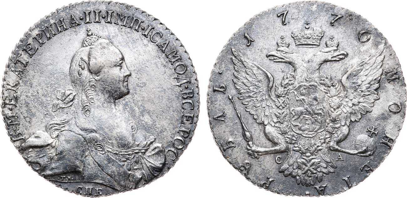 Рубли императрицы Екатерины II 1770 года с буквами минцмейстера "СА" под орлом встречаются очень редко.