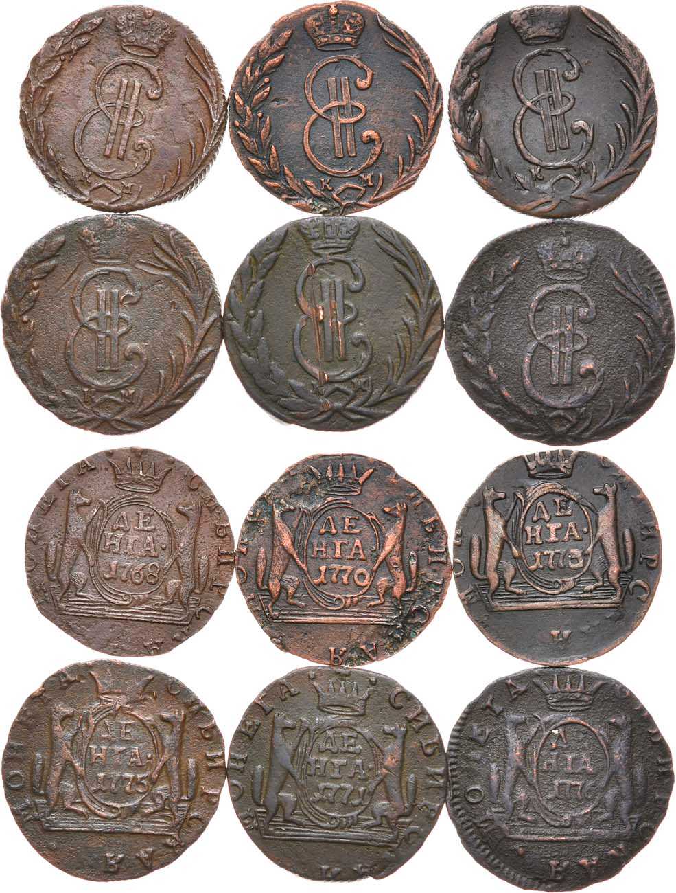 Медь. Деньга 1768 года. КМ. 2,26 г. Деньга 1770 года. КМ. 1,92 г. Деньга 1771 года. КМ. 3,97 г. Деньга 1773 года. КМ. 2,07 г. Деньга 1775 года. КМ. 2,67 г. Деньга 1776 года. КМ. 2,18 г.