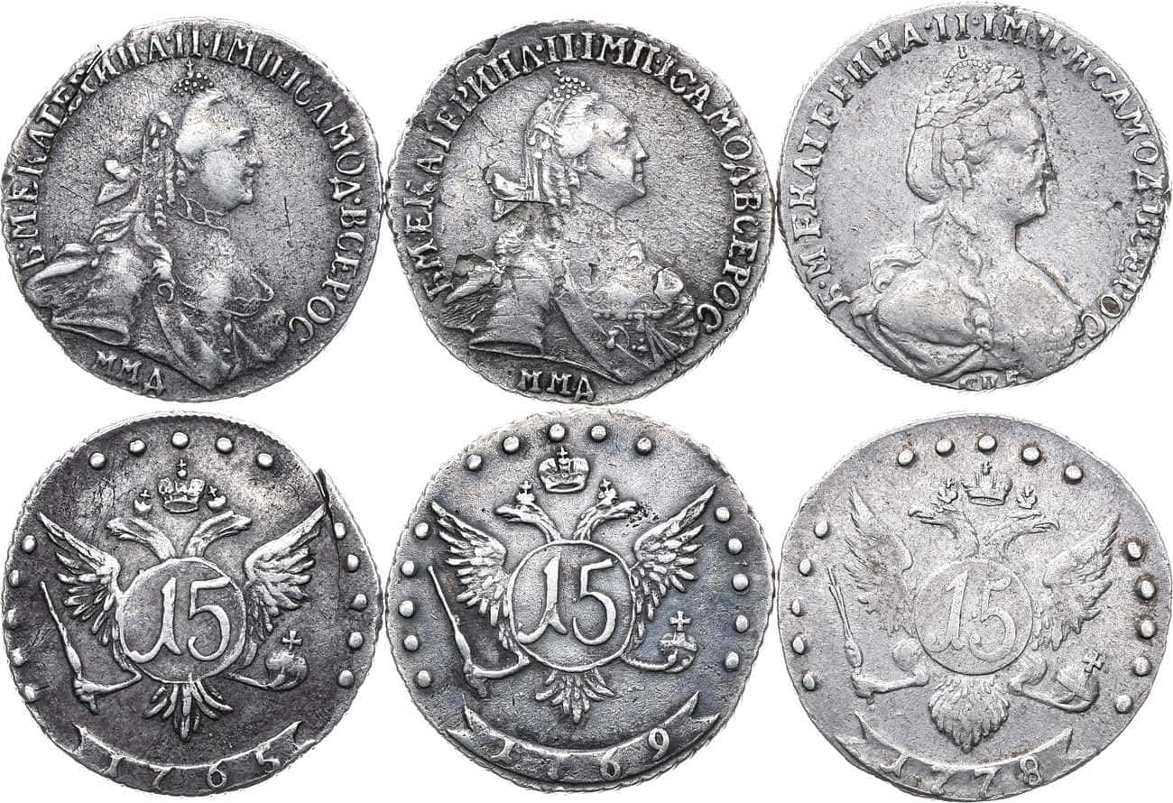 Серебро. 15 копеек 1765 года. ММД. 3,38 г. 15 копеек 1769 года. ММД. 3,45 г. 15 копеек 1778 года. СПБ. 3,94 г.