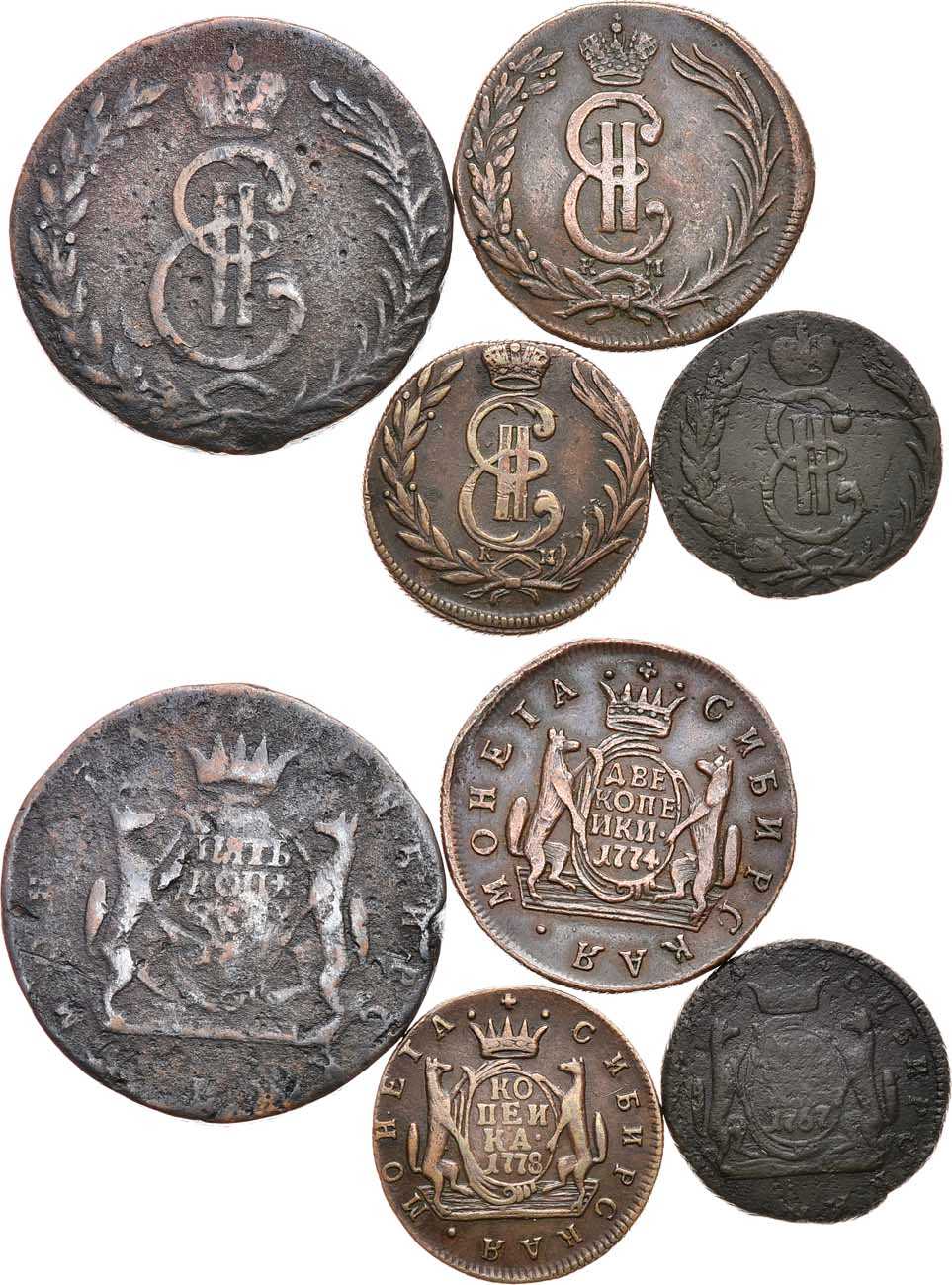 Медь. Копейка 1767 года. 6,94 г. 5 копеек 1767 года. 32,47 г. 2 копейки 1774 года. КМ. 13,88 г. Копейка 1778 года. КМ. 7,11 г.