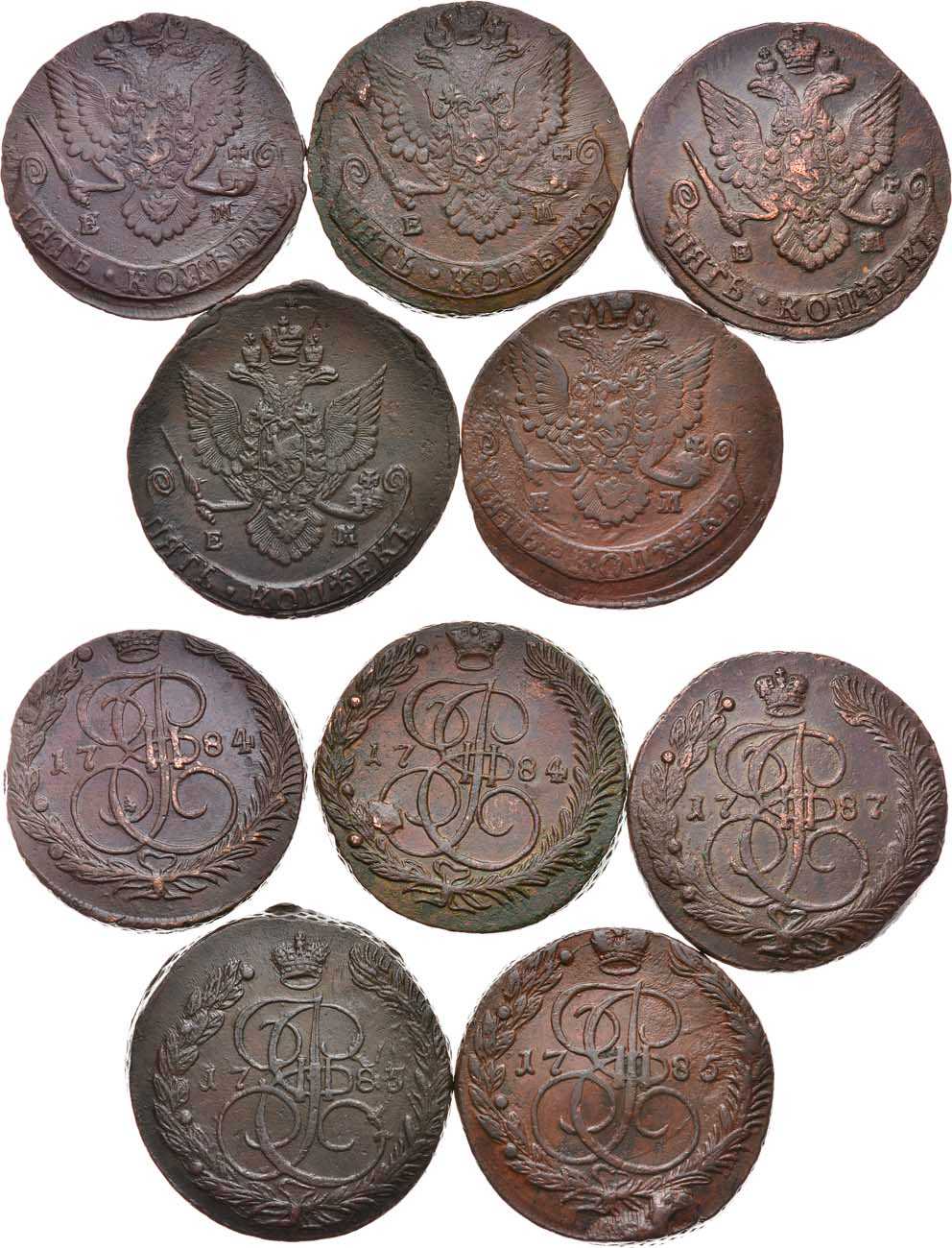 Медь. 5 копеек 1784 года. ЕМ. 56,24 г. 5 копеек 1784 года. ЕМ. 53,32 г. 5 копеек 1785 года. ЕМ. 56,75 г. 5 копеек 1785 года. ЕМ. 47,23 г. 5 копеек 1787 года. ЕМ. 53,72 г.