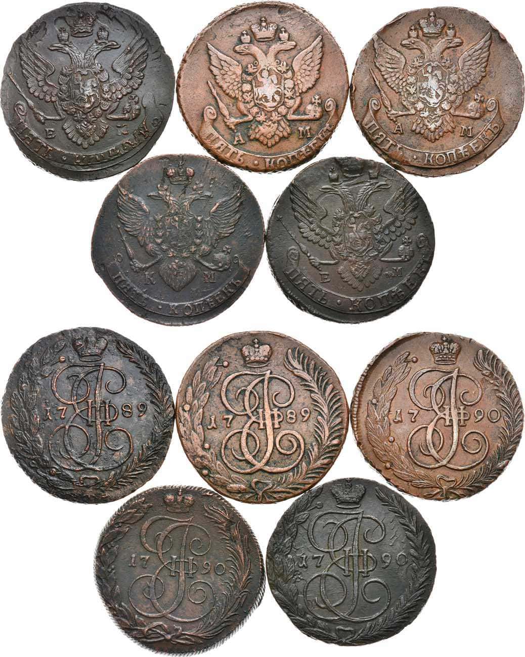 Медь. 5 копеек 1789 года. АМ. 54,37 г. 5 копеек 1789 года. ЕМ. 48,54 г. 5 копеек 1790 года. ЕМ. 53,35 г. 5 копеек 1790 года. АМ. 48,21 г. 5 копеек 1790 года. КМ. 49,97 г.