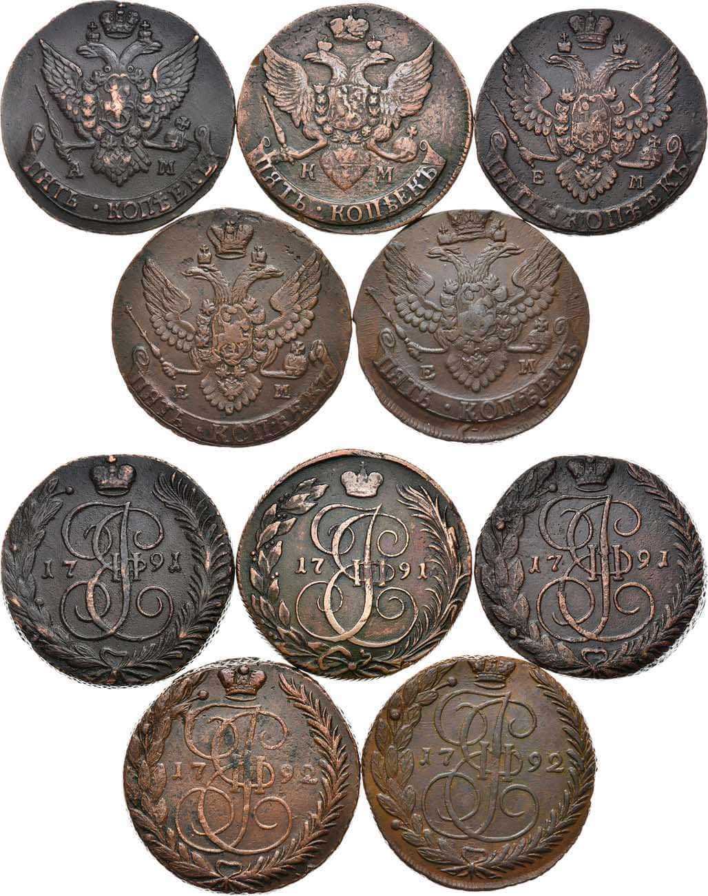 Медь. 5 копеек 1791 года. КМ. 51,05 г. 5 копеек 1791 года. ЕМ. 50,83 г. 5 копеек 1791 года. АМ. 51,50 г. 5 копеек 1792 года. ЕМ. 52,41 г. 5 копеек 1792 года. ЕМ. 42,77 г.