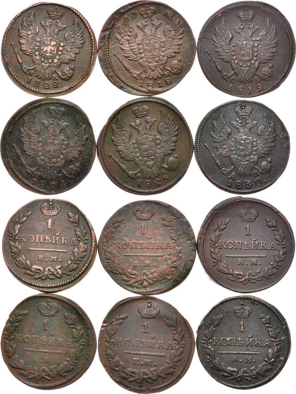 Медь. 1 копейка 1818 года. ЕМ-НМ. 6,21 г. 1 копейка1819 года. КМ-АД. 7,17 г. 1 копейка 1824 года. КМ-ПГ. 6,44 г. 1 копейка 1825 года. ЕМ-ИК. 5,48 г. 1 копейка 1828 года. ЕМ-ИК. 6,45 г. 1 копейка 1830 года. КМ-АМ. 6,16 г.