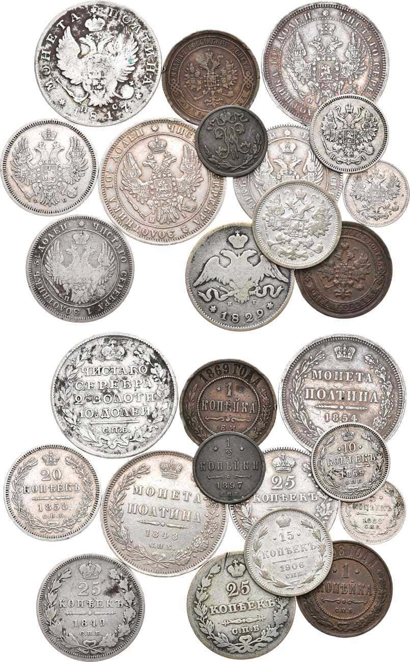 Серебро. Полтина 1854 года. СПБ-HI. 10,31 г. Полтина 1848 года. СПБ-HI. 10,38 г. Полтина 1817 года. СПБ-ПС. 9,92 г. 25 копеек 1849 года. СПБ-ПА. 5 г. 25 копеек 1838 года. СПБ-НГ. 4,86 г. 25 копеек 1829 года. СПБ-НГ. 4,84 г. 20 копеек 1858 года. СПБ-ФБ. 4,13 г. 15 копеек 1906 года. СПБ-ЭБ. 2,57 г. 10 копеек 1869 года. СПБ-HI, 1,90 г. 5 копеек 1888 года. СПБ-АГ, 0,90 г. 1 копейка 1898 года. СПБ. 3,22 г. 1 копейка 1869 года. Е.М. 3,30 г. 1/2 копейки 1897 года. СПБ, 1,62 г.
