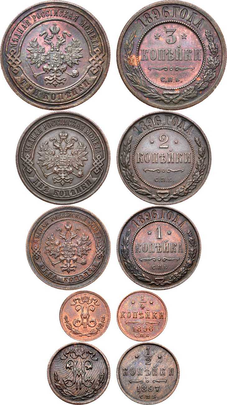 Медь. Бирмингемский монетный двор. 3 копейки 1896 года. СПБ. 9,80г. Уздеников 3869, Биткин 283. MS 62. 2 копейки 1896 года. СПБ. 6,49г. Уздеников 3870, Биткин 286. MS 60. 1 копейка 1896 года. СПБ. 3,27г. Уздеников 3871, Биткин 289. MS 61. 1/4 копейки 1896 года. СПБ. 1,65г. Уздеников 3873, Биткин 295. MS 60. 1/2 копейки 1897 года. СПБ. 0,88г. Уздеников 3877, Биткин 293. MS 61.